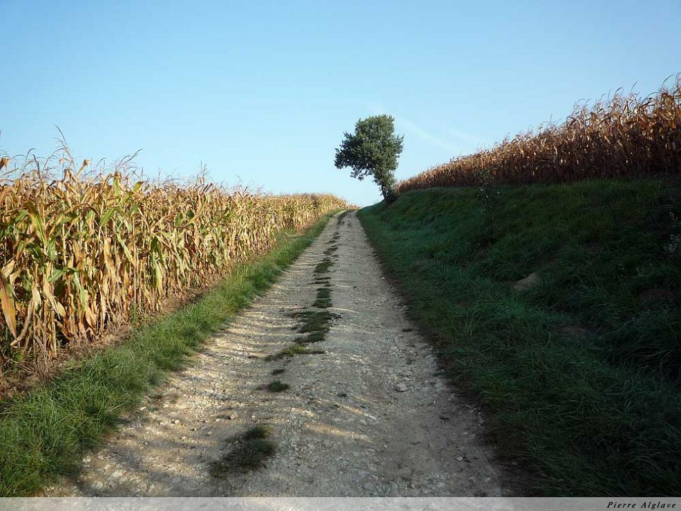 Le chemin est entre deux champs de maïs, on peut dire entre deux murs de maïs. Lors d’une étape précédente des pèlerins évoquaient avec des accents déprimés cette traversée du Gers qu’ils avaient déjà faite à une autre occasion. Moi je trouve ça paisible, mais c’est vrai qu’il fait beau et par temps de pluie c’est peut-être moins bucolique.