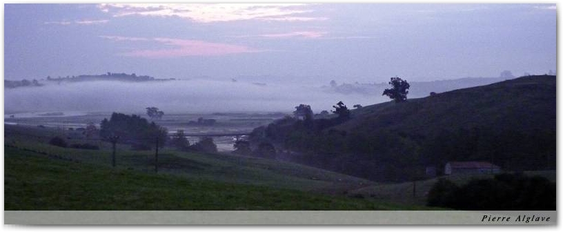 J’attaque ma 8ème semaine, il est 7h45. J’ai quitté le gîte il y a un quart d’heure, le jour se lève à peine et après l’éclairage de la ville je me retrouve dans la semi-obscurité de la campagne, il y a un peu de brume, le paysage est très beau, je tente quelques photos, elles auront probablement du « grain » mais cela pourrait contribuer à rendre la magie de l’instant, son caractère éphémère. Grosse frayeur ! Je viens de faire un écart pour éviter une voiture qui ne m’avait probablement pas aperçu dans la pénombre mais qui heureusement ne roulait pas vite ; je sors ma lampe frontale. J’aime bien ces départs matinaux, on ne voit personne mais les bruits environnants me racontent que je ne suis pas le seul et sûrement pas le premier à commencer cette journée : ronronnement d’une trayeuse, chant d’un coq, bruissement de bétail dans les prés …