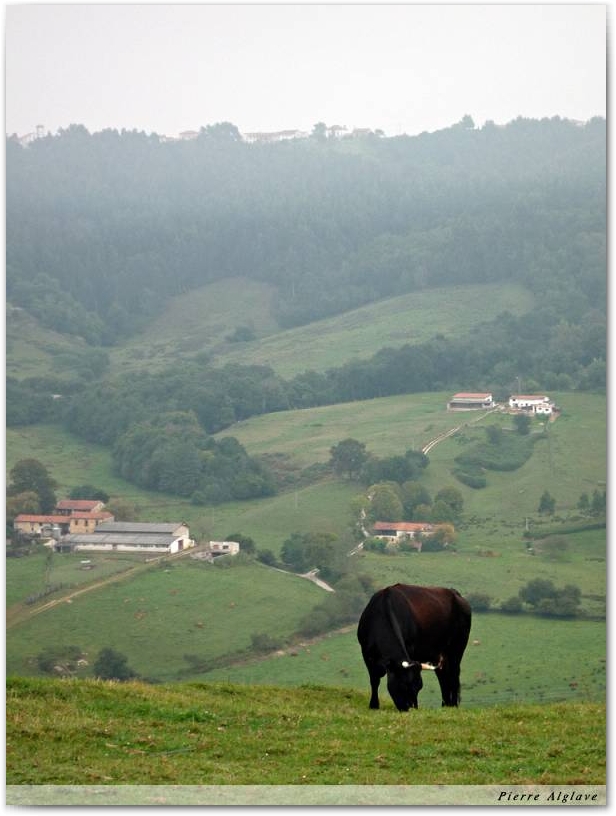 11h15, en haut d’un raidillon sévère à la sortie de Unquera vers Mustio j’entre en Asturies. Les balises sont un peu différentes : en céramique, coquille jaune sur fond bleu. Le ciel est de plus en plus couvert : à ma gauche la montagne est entièrement dans les nuages à ma droite le paysage est un peu brumeux.