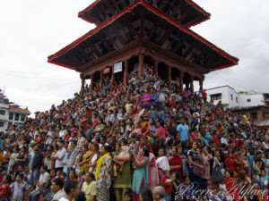Nous avons la chance d’être ici en pleines fêtes de l’Indra Jatra qui marquent la fin de la mousson. A cette occasion le quartier est en effervescence, partout des décorations, des plate-formes érigées, des lieux de cultes comme le Masque de Sweta Bhairava exceptionnellement ouverts à la dévotion des fidèles et à la curiosité des touristes. Des prêtres et des sortes de chamans avec une étrange coiffe à facettes officient, des marchants proposent tout ce qui est nécessaire pour faire ses offrandes ou abordent les touristes avec d’incontournables souvenirs : flûtes, cartes postales, cadenas typiques, bijoux… De temps en temps un groupe de masques avec épées, tambours et pétards accompagné parfois d’un dragon fend la foule. La journée sera clôturée par un défilé de chars en l’honneur de la Kumari, une jeune fille considérée comme une déesse vivante.