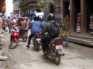 Plus on s’approche du centre ville plus la circulation s’intensifie, piétons et motos se croisent harmonieusement, sans heurts mais non sans bruit, le klaxon est un équipement indispensable. Bientôt nous sommes devant le temple Kasthamandap dont Katmandou tire son nom à l’entrée de Durbar Square au centre de la vieille ville.