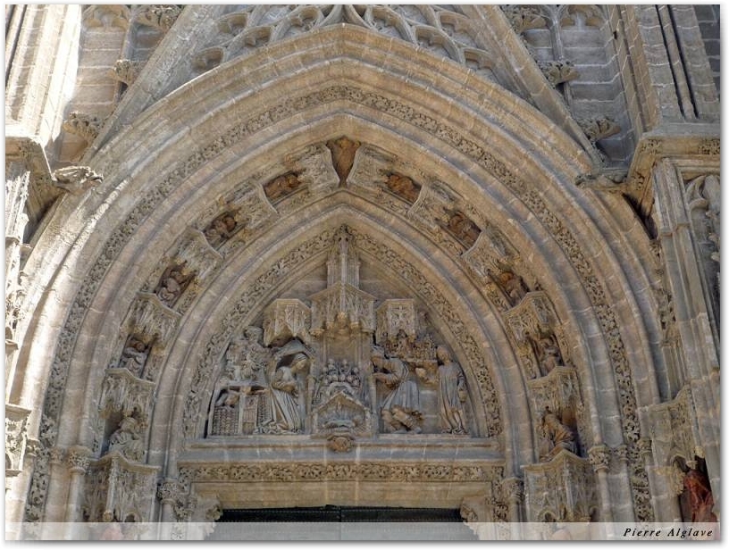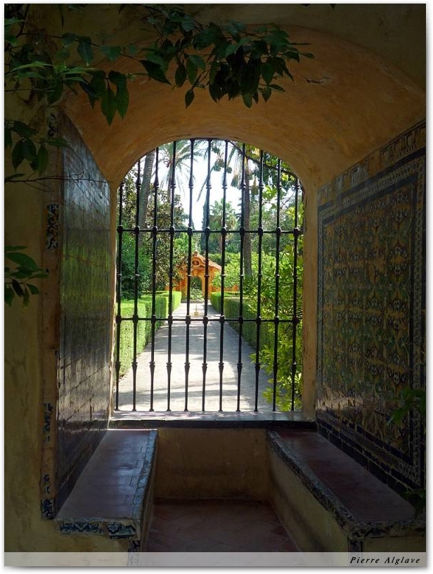 Dans l’avion j’étais à côté d’un jeune couple, apparemment très amoureux, digne représentant de 80% des passagers, tous équipés de leur téléphone portable dernier cri. Voyage impeccable. Descente sur  Séville accompagnée par un rapace qui semblait survoler à reculons une plaine à dominante ocre. Atterrissage pile à l’heure. Récupération de mon sac à dos, entier. C’était mon angoisse. Il faut bien s’en trouver une. J’avais longtemps hésité, consulté des forums, pris conseil notamment auprès de Christian mon compagnon Canadien sur le Camino Norte pour qui, rassembler et attacher les bretelles pour éviter qu’elles s’accrochent lors des manutentions vers ou hors de la soute à bagages, suffisait amplement. Prudent, j’avais opté pour l’enfournement dans un solide sac à gravas. Sur le tapis roulant, dans la famille sac à dos, il y avait de tout, ceux fidèles aux préceptes de Christian, ceux momifiés par des bandes plastiques, d’autres nichés dans leur housse anti-pluie et enfin les sacs zen, tels quels, bretelles et lanières aux vents. Tous sains et saufs !Descente sur SévilleJ’avais déjà eu l’occasion d’arpenter Séville en différentes saisons et je décidai de visiter le palais de l’Alcazar que je ne connaissais pas, ses jardins, ses bassins, ses patios portant l’espérance d’une provision de fraîcheur en vue des jours à venir.  Puis je m’installai pour une collation dans une sorte de guinguette sur les bords du Guadalquivir à l’ombre d’un oranger dont deux fruits vinrent s’écraser lourdement à mes côtés avec bruit impressionnant ; l’exotisme n’est pas sans danger. Depuis le quai, en contre-bas, les rires sonores et les blagues incompréhensibles de pêcheurs montaient vers moi. Calme et volupté.Palais de l`AlcazarLe soir, vers 21h, la chaleur dans le dortoir où j’étais revenu faire une courte pause était devenue insupportable, je choisis de revenir manger sur les bords de l’eau toute proche dans l’espoir d’une température plus clémente. Les pêcheurs rangeaient leur matériel et quittaient les quais en bandes joyeuses, des canoës montaient et descendaient le courant et … les touristes avaient envahi les berges provoquant multiplication et surenchère des restaurants ; je finis quand même par trouver à un prix abordable une énorme paella dont je dus laisser la moitié. Au retour la traversée de chaque ruelle parallèle au fleuve s’accompagnait d’une hausse de quelques degrés jusqu’à atteindre  la fournaise du départ.