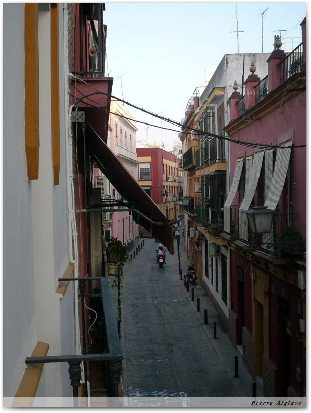 J’ai quitté l’auberge « Triana Backpackers »  un peu avant 8h, l’éclairage urbain venait juste de s’éteindre et le soleil encore très bas diffusait dans le ciel une lueur grise, fausse promesse d’un temps couvert, d’un peu de fraîcheur.   Vue sur le quartier de Triana à SévilleHier en arrivant à l’aéroport, vers midi, il faisait 33°, une heure après, au centre ville, il s’affichait 36°. Je n’avais qu’une hâte, rejoindre l’auberge pour y troquer pantalon et chemise à manches longues pour une tenue plus légère. J’avais voulu de la chaleur, je n’allais pas être déçu.