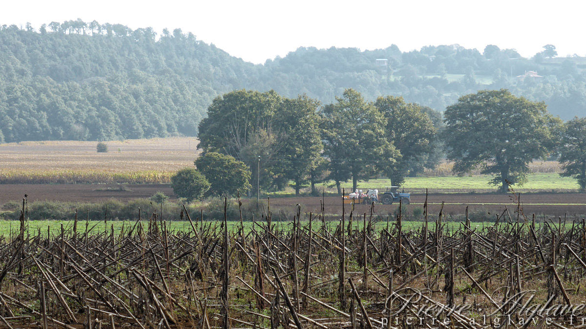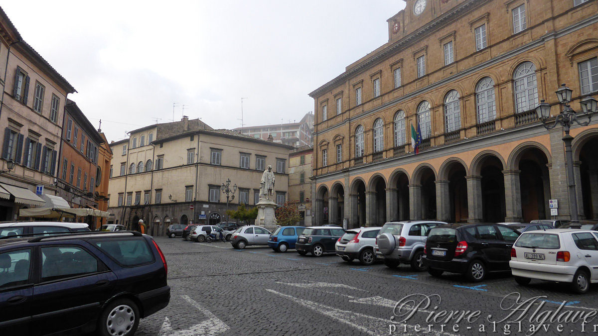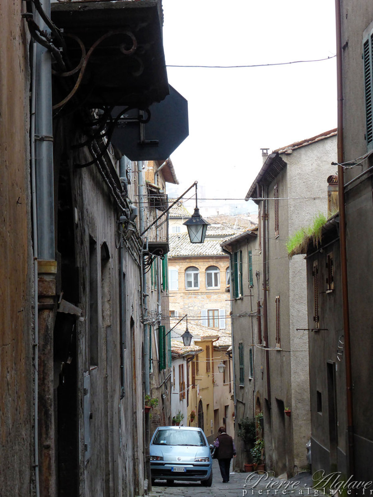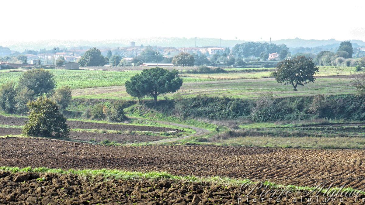 On est désormais à l’heure d’hiver, il neuf heures. Je quitte Acquapendente direction Bolsena à une vingtaine de kilomètres. Ce matin j’ai pris mon petit-déjeuner dans un bistrot avec un patron très sympathique même s’il était nul en informatique : le wifi était en panne, mais, d’après lui, seul son fils absent aurait su le réactiver. Avant de prendre la route j’ai refait un petit tour dans la ville qui cette fois, est-ce la brume ambiante, m’a parue triste : rue étroites et désertes, maisons aux couleurs ternes… Il fait un peu frais, mais je suis juste en chemisette et gilet, je compte sur la marche pour me réchauffer. Il y a quelques jours j’avais un problème au genou droit et je craignais le pire, mais bizarrement il a totalement disparu.