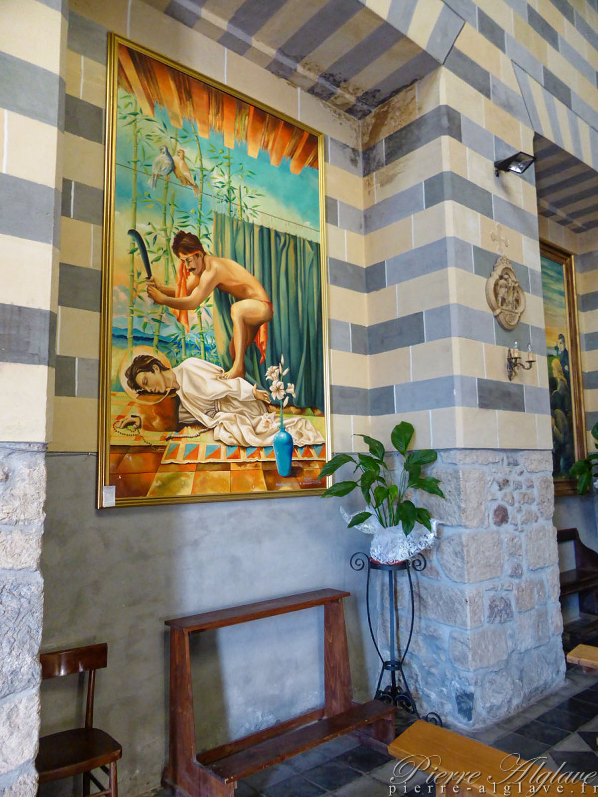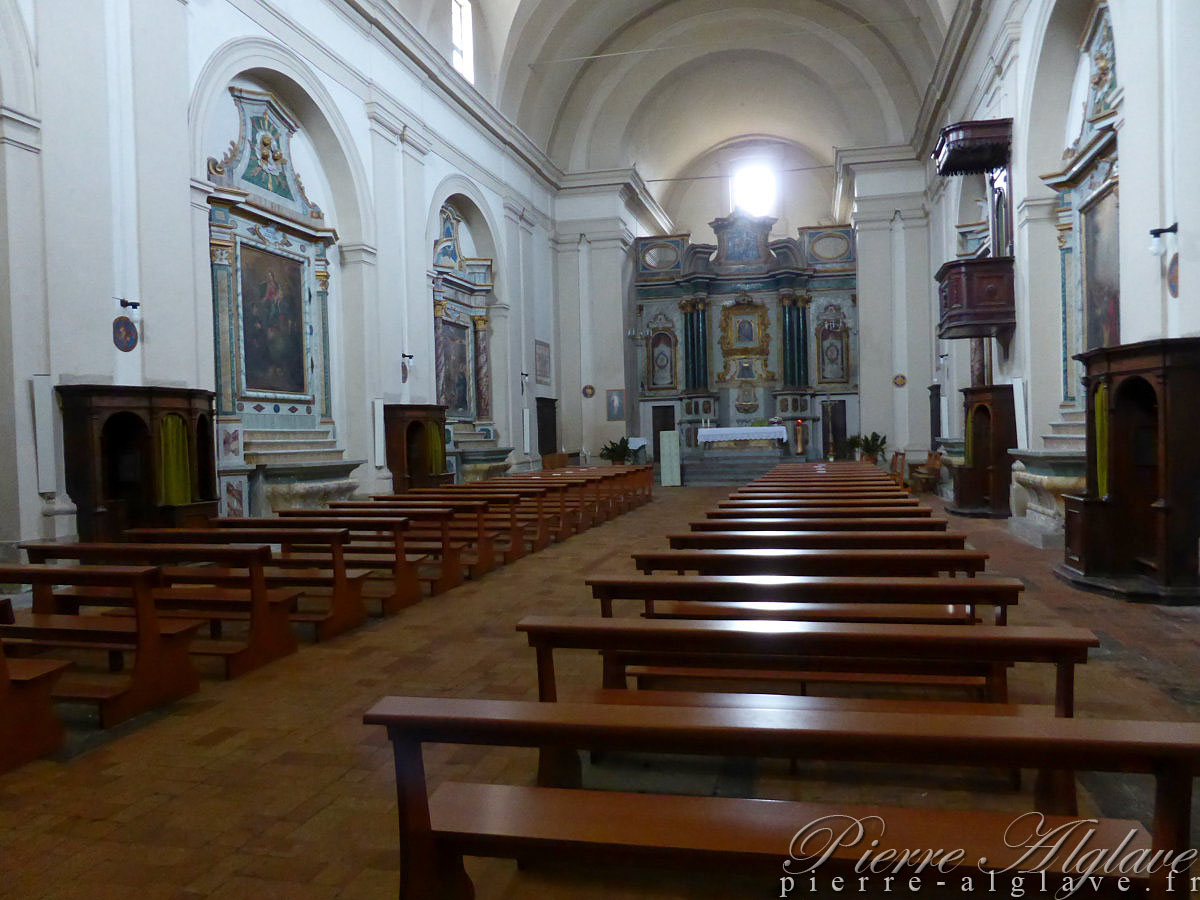 On arrive par la vieille ville en empruntant des ruelles en pente, heureusement toujours en descente, qui conduisent jusqu’à la place Sainte-Christine où se trouve la basilique du même nom. En avance sur l’heure annoncée pour mon arrivée j’en profite pour la visiter rapidement. Un miracle s’y serait produit en 1263, une hostie aurait saigné. Une petite chapelle y est consacrée à Saint-Martin de Tours. À l’entrée un panneau indiquait que le port du pantalon était obligatoire, mais personne ne m’a fait de remarque : privilège du « pellegrino ».