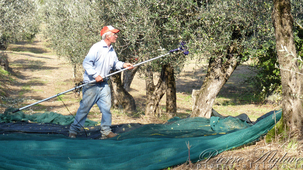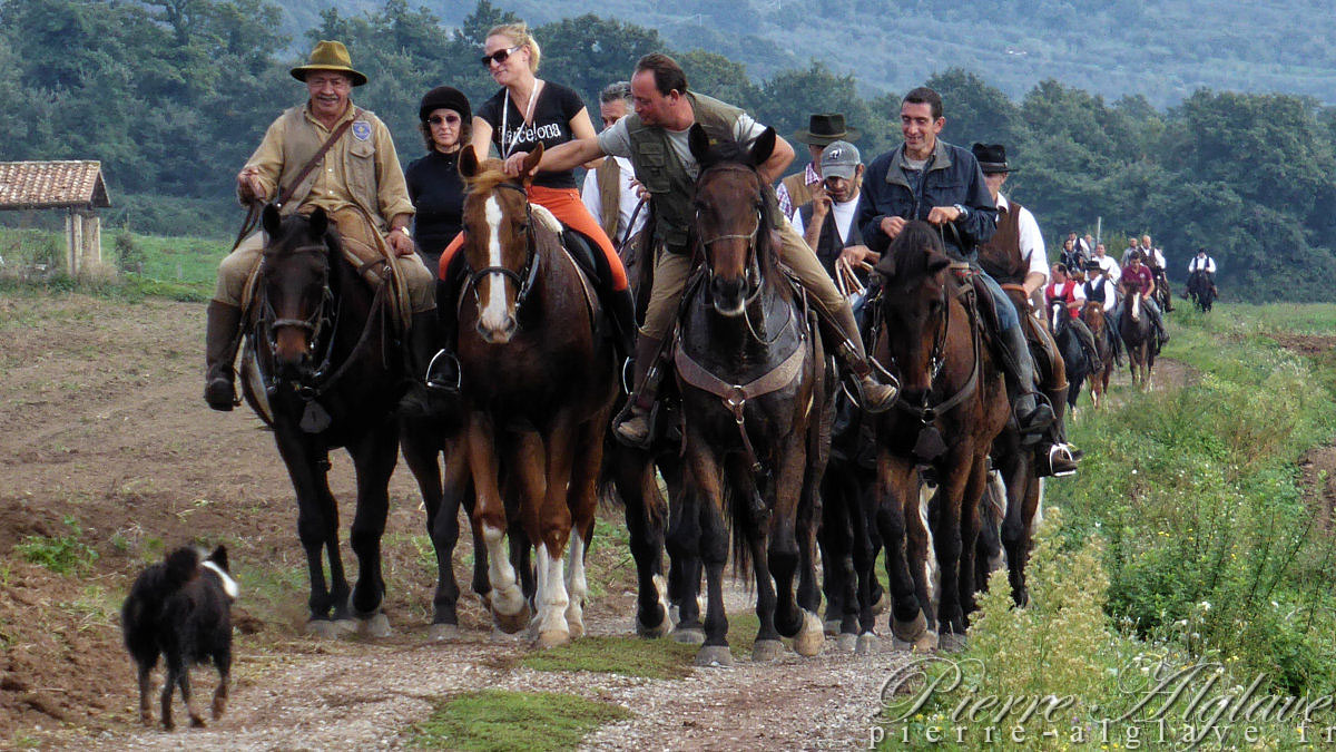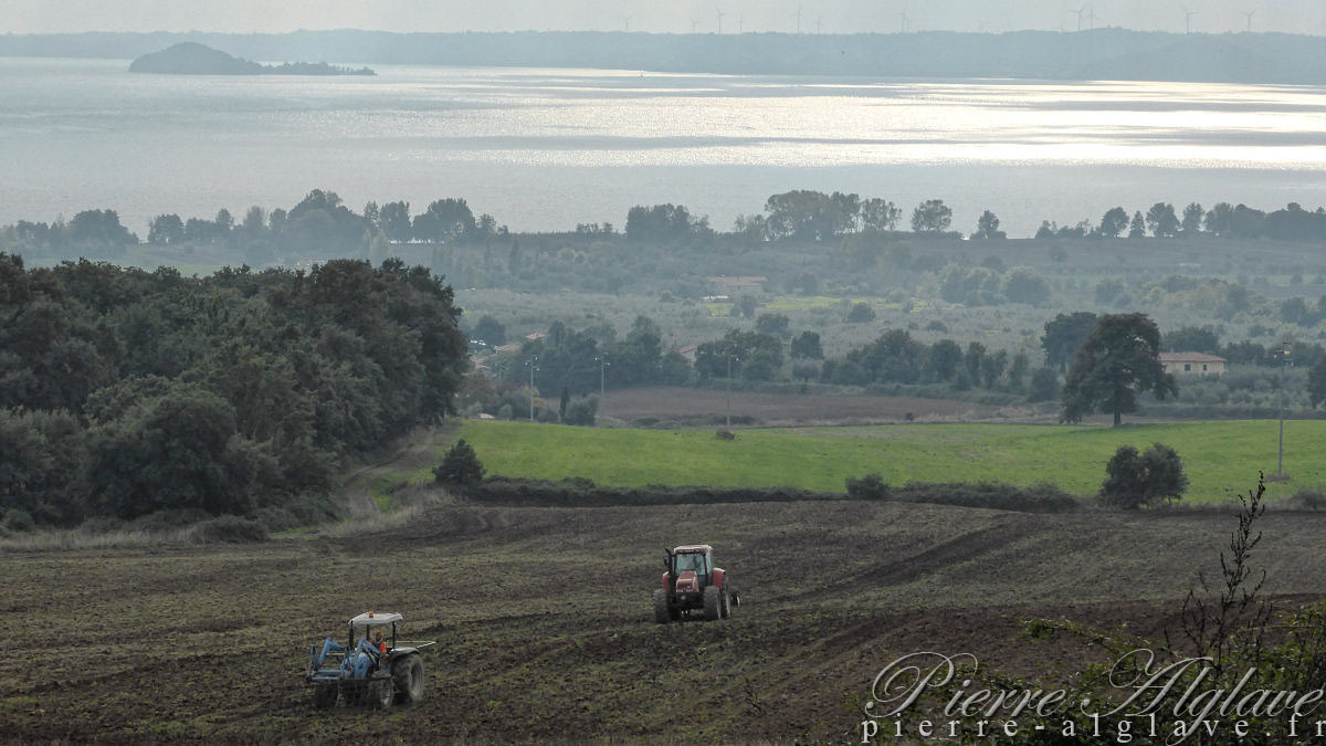 Je suis arrivé à Bolsena vers quinze heures trente. Le trajet bien balisé, le plus souvent en descente, avec le lac en toile de fond était très agréable. Pas de trêve dominicale pour l’agriculture, des tracteurs s’affairaient dans les champs et la cueillette des olives à l’aide de grandes gaules battait son plein. En route j’ai été croisé par un groupe joyeux d’une cinquantaine de cavaliers, impressionnant ! À proximité de la ville un petit vent frais s’est levé, on se serait presque cru en bord de mer avec ces belles villas dominant l’étendue d’eau surplombée par les remparts de la ville.