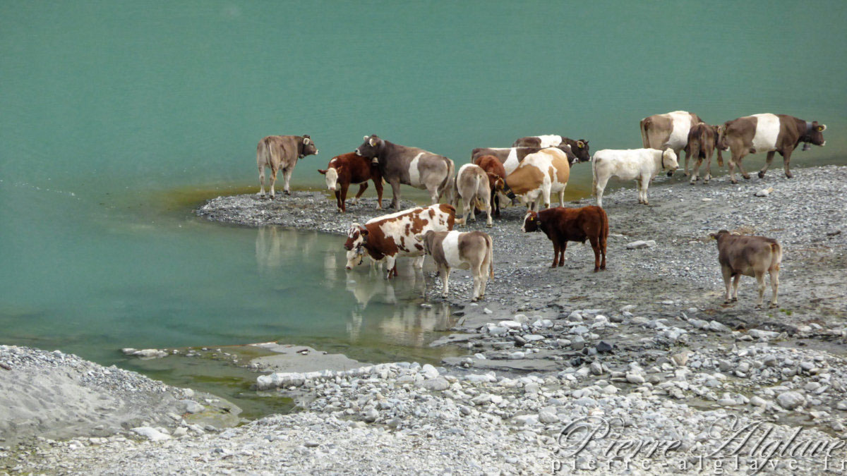 9 heures, à environ 1800 mètres, me voici au niveau du lac de retenue, des vaches s’y abreuvent et des pêcheurs tentent leur chance. C’est paisible, la vue est splendide. Le chemin suit tranquillement le bord du lac, je l’imite, déjà environ 200 mètres de grimpés, tout va bien, j’ai le temps. Tout à coup un troupeau de vaches, avec au milieu un mouton égaré, déboule de la montagne et se précipite en direction de l’eau, on se croirait dans un western. Est-ce la fin de la saison des alpages ? Cela confirme-t-il le mauvais temps annoncé pour les prochains jours ? En tout cas le ciel est désormais très bleu et le soleil est apparu derrière les sommets et, même si le fond de l’air reste frais, combiné à l’effort de la marche il commence à chauffer.