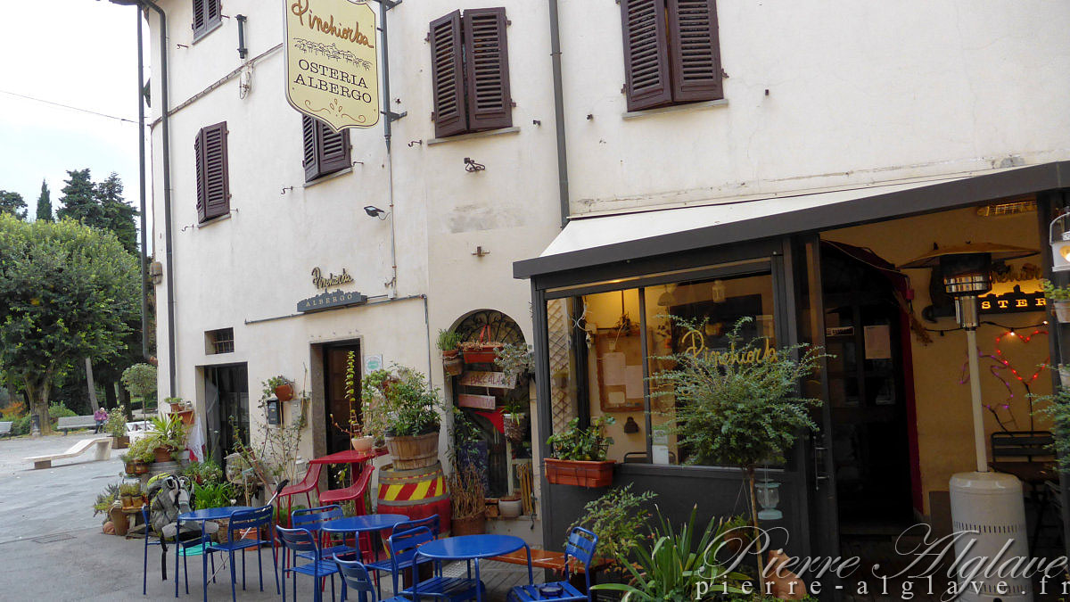 16 h 45, après avoir fait un détour par la belle église de Chianni, me voici devant l’hôtel Pinchiorba à Gambassi Terme. En fin de compte il n’aura pas plu et il fait doux, je suis en chemisette. Une affichette sur la porte m’annonce que l’accueil est pour l’instant fermé. J’appelle le numéro indiqué, où on me répond « Je suis là dans 20 minutes ». J’en profite pour consulter mes mails, Hélène aimerait avoir des prévisions sur mon jour d’arrivée. En fait moi aussi car si les prochaines étapes se déroulent comme celle-ci cela risque de fortement contrarier mes objectifs. Je vais étudier la question à tête et jambes reposées.