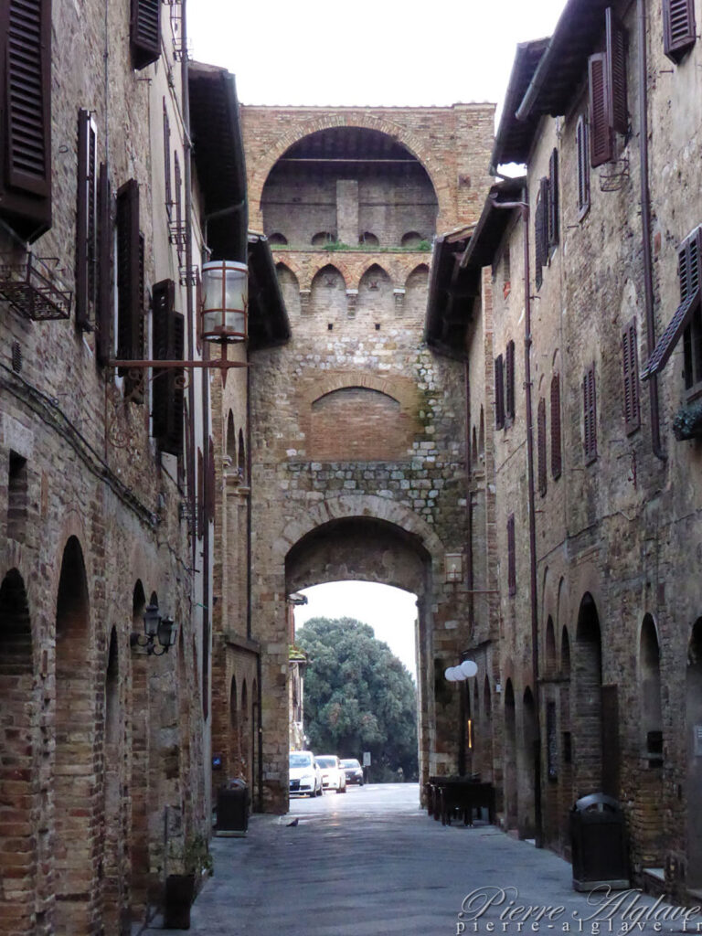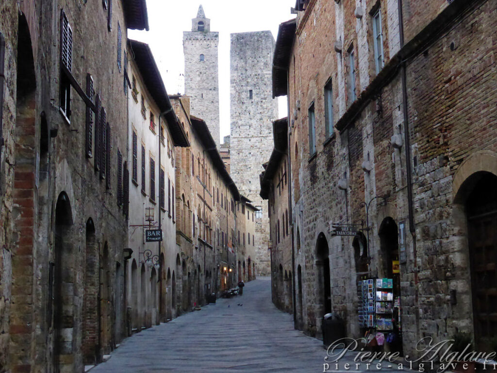 Il est 7 h 45 et je redécouvre avec plaisir San Gimignano cette fois par temps sec, la ville est déserte, les touristes ont disparu, une ville splendide dont une fois les remparts franchis je peux enfin avoir une vue d’ensemble sur ses fameuses tours.