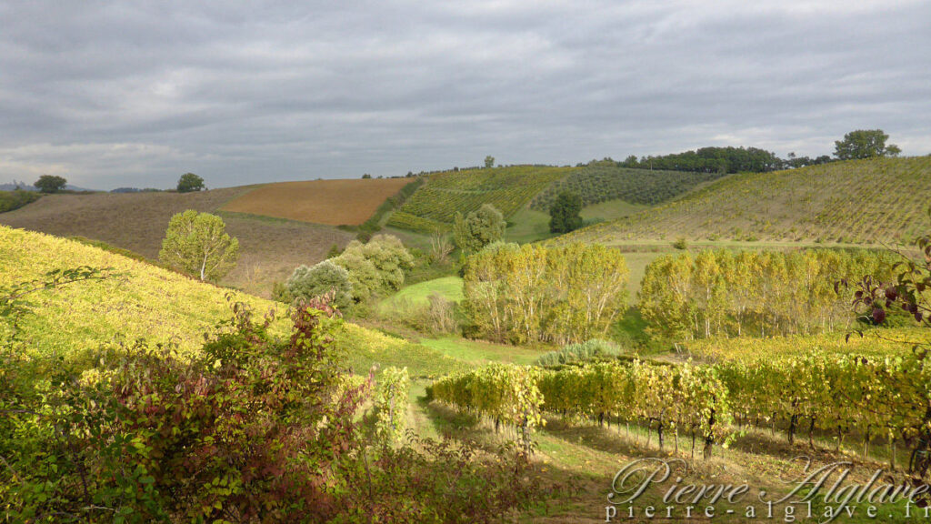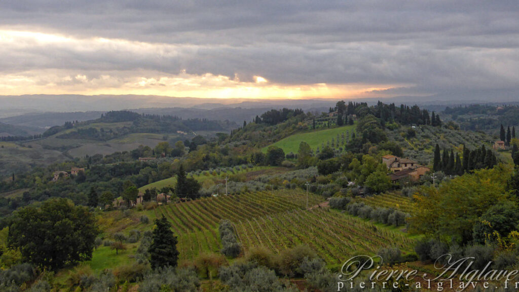 Pour rejoindre Abbadia d’Isola j’ai laissé le choix du trajet à l’application que m’avait conseillée Yann. En allant au plus court il va me faire passer par Colle di Val d’Elsa. En fait je comprendrai plus tard que c’est une variante du tracé officiel de la Via Francigena. Elle alterne goudron, larges chemins de graviers et petits sentiers. Le paysage est magnifique et, compensant ma frustration d’hier, je me régale à prendre des photos. Mes bâtons dans une main, je ne force pas, je prends mon temps. Çà et là des glissements de terrain témoignent de la vigueur des précipitations de la veille.