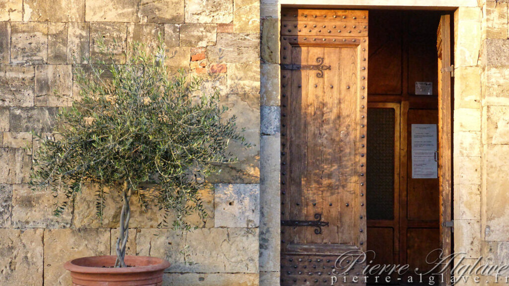 14 h 30, me voici à Abbadia d’Isola. Sur la boîte aux lettres de l’abbaye où j’ai prévu de m’arrêter un mot en italien annonce que l’accueil pèlerin est fermé pour l’hiver. Peu sûr de ma maîtrise de la langue de Dante je demande de l’aide à deux passants. Mais ils ne comprennent ni l’italien, ni le français. « Tadeschi ! », ce sont des Allemands. Ils pointent du doigt mes chaussures et en anglais me demandent si c’est toujours ma première paire : ils ont la même soif de connaissance sur le « peregrinus ordinarius » que leurs collègues qui m’avaient filmé peu avant Lucca. Poursuivant mon enquête je vais me renseigner au café d’en face où on m’affirme que l’accueil pèlerin est bien ouvert. J’appelle le numéro indiqué dans mon guide, où cette fois on me confirme que c’est effectivement fermé. Fin du suspense.