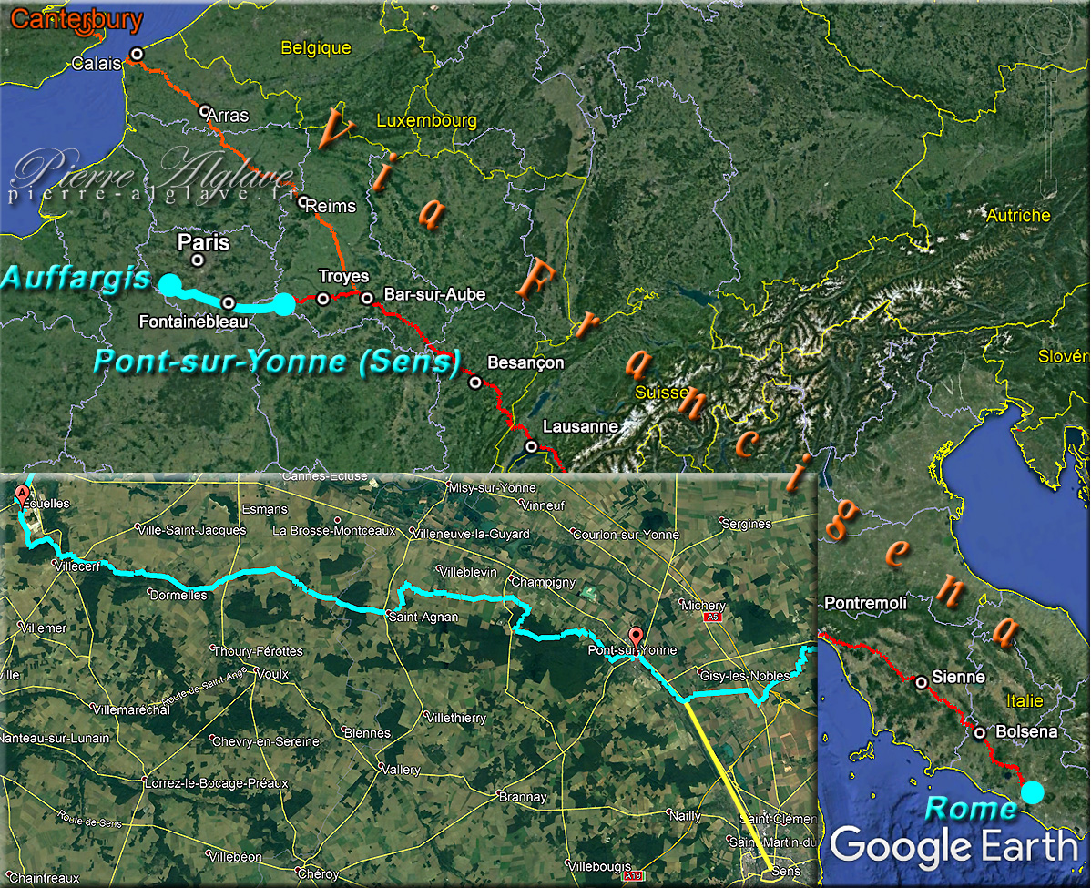 18h30, ça y est je suis à la gare de Pont-sur-Yonne où Ramon va venir me récupérer. Pas un bistrot, même pas un banc. Il a fallu que je m’éloigne un peu pour en trouver un. Je suis content d’être arrivé. Même les mobylettes qui tournent sur la place ne me gâchent pas ce plaisir. Sur la fin la conduite d’eau escalade une colline qui après quarante bornes m’a paru très abrupte.
