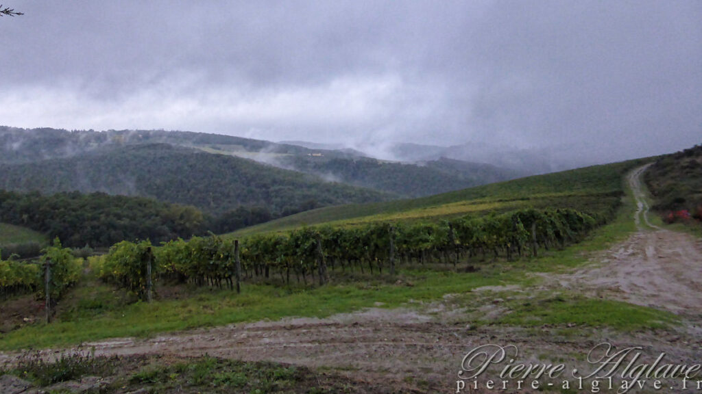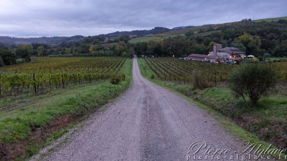 J’envisage de faire la quarantaine de bornes jusqu’à Monteriggioni. S’arrêter à San Gimignano dans une quinzaine de kilomètres n’aurait pas vraiment de sens, même si c’est une ville décrite comme magnifique. Aïe, là, j’entends le tonnerre. On va voir comment tout cela évolue.