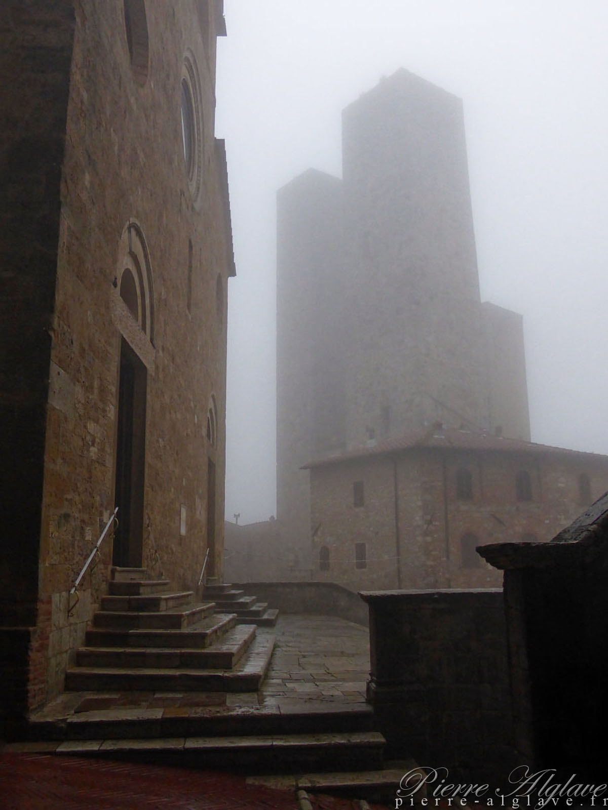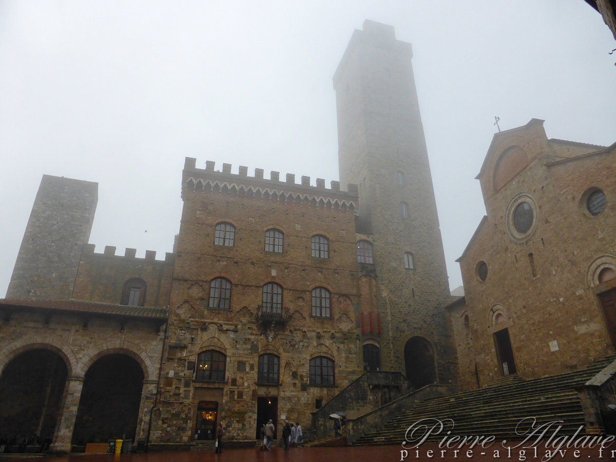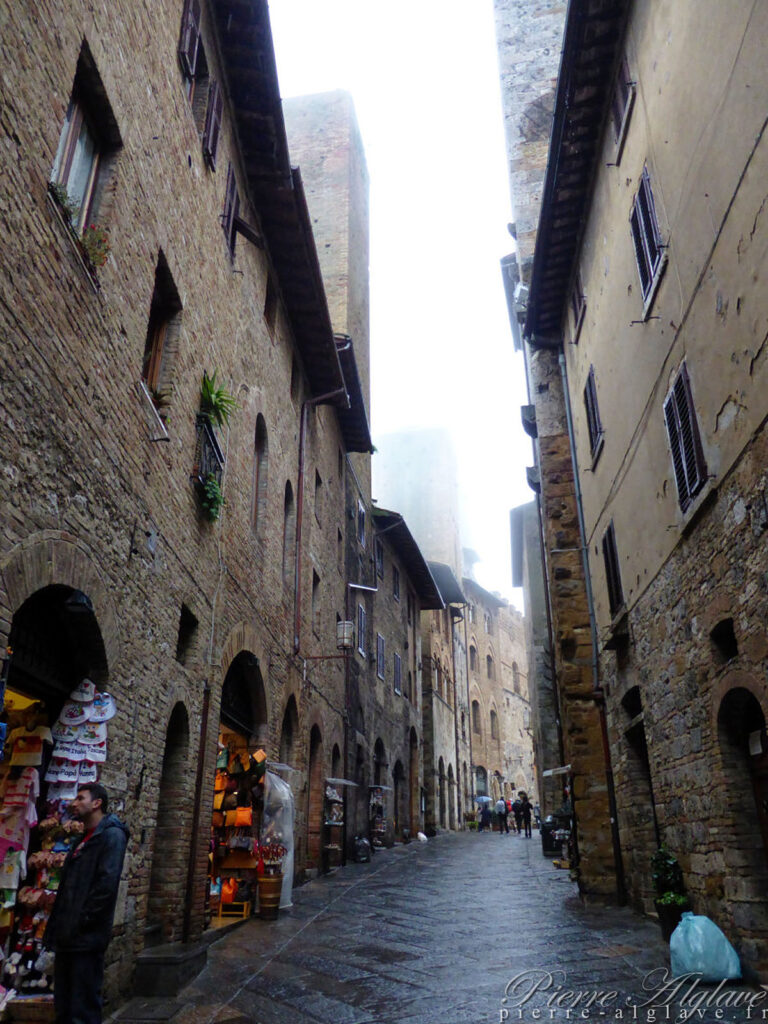 Quand je suis arrivé ici il y a eu une éclaircie. J’en ai profité pour enlever mes chaussures et tordre mes chaussettes. J’ai d’abord pensé que je pourrais continuer jusqu’à Monteriggioni ou Abbadia a Isola après avoir visité la ville, mais j’étais à peine sur la place principale devant le Duomo que sont tombés des abats d’eau accompagnés de rafales de vent. Avec d’autres touristes nous nous étions réfugiés sous la voûte profonde d’un porche, mais le vent chargé de pluie s’y est brusquement engouffré et tout le monde fût trempé déclenchant un éclat de rire général.
